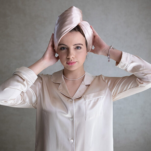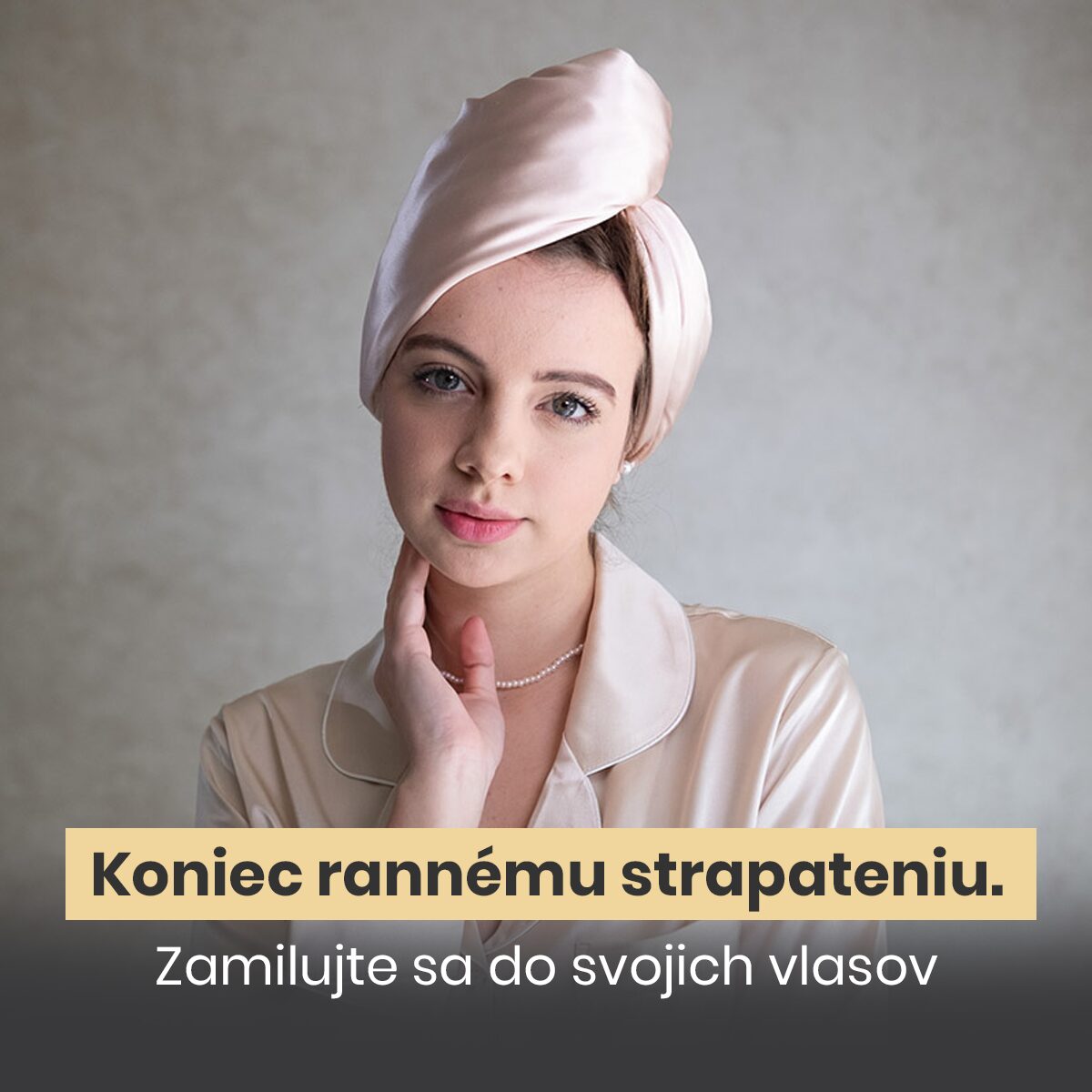 Hodvábny turban minimalizuje trenie vlasov.