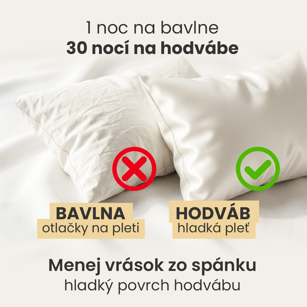 🌙 Pleť sa počas spánku dotýka hodvábu, ktorý ju necháva ráno hladkú, oddýchnutú a mladistvo žiarivú.